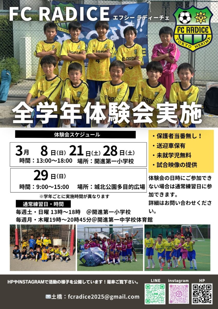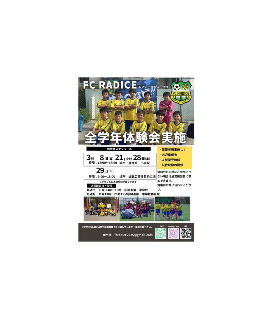 この度、FC RADICE 新1年生体験会を開催いたします⚽️ 📅 3月15日(日) 🕘 9:00〜11:00 📍 城北公園多目的運動場 4月か…